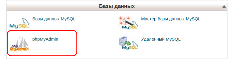 Самый простой способ восстановить пароль 一 сделать это через cPanel. Зайдите в панель управления хостингом и найдите блок “Базы данных”, а в нем phpMyAdmin: