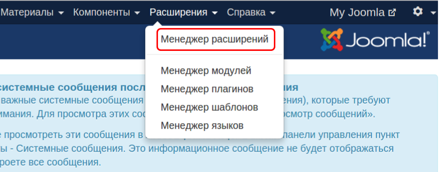 Поскольку существует два вида установки шаблона, рассмотрим каждый из них детально. Для начала зайдите в панель управления Joomla и перейдите в раздел “Расширения” → “Менеджер расширений”: