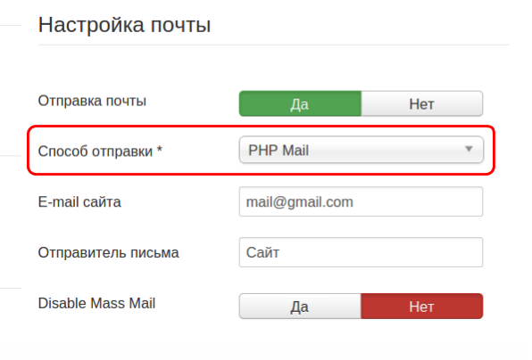 Теперь можно переходить непосредственно к настройке почты. Самым популярным считается PHPMail. В поле “Отправка почты” ставите “Да”, вписываете e-mail сайта, название портала, в поле Disable Mass Mail выбираете “Нет”: